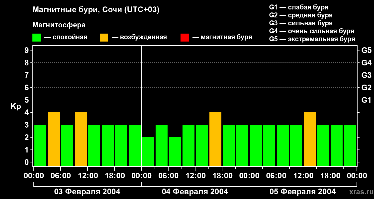 Изменения геомагнитного индекса Kp с 3 по 5 февраля 2004 года для средних широт