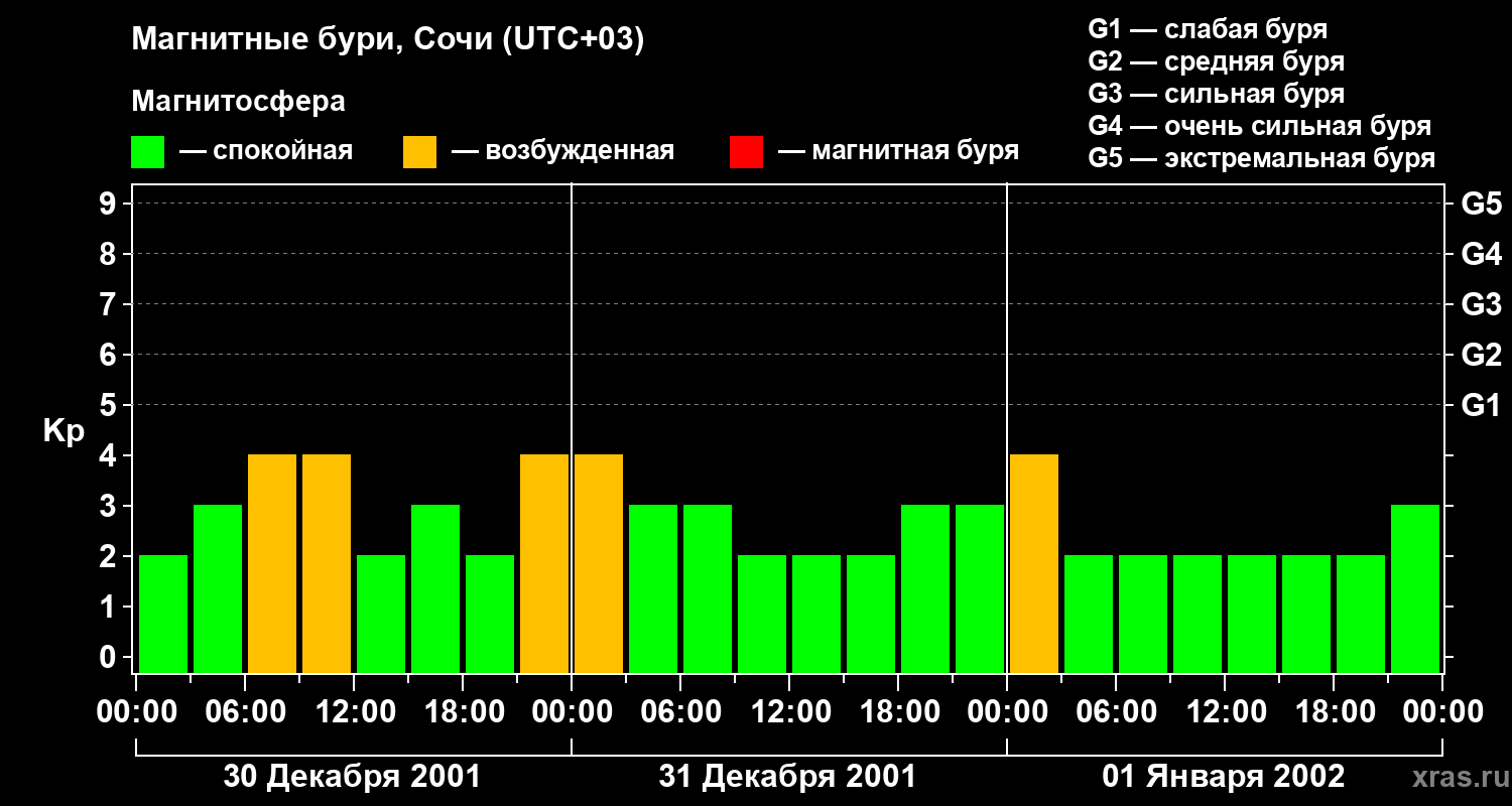 Изменения геомагнитного индекса Kp с 30 декабря 2001 года по 1 января 2002 года для средних широт