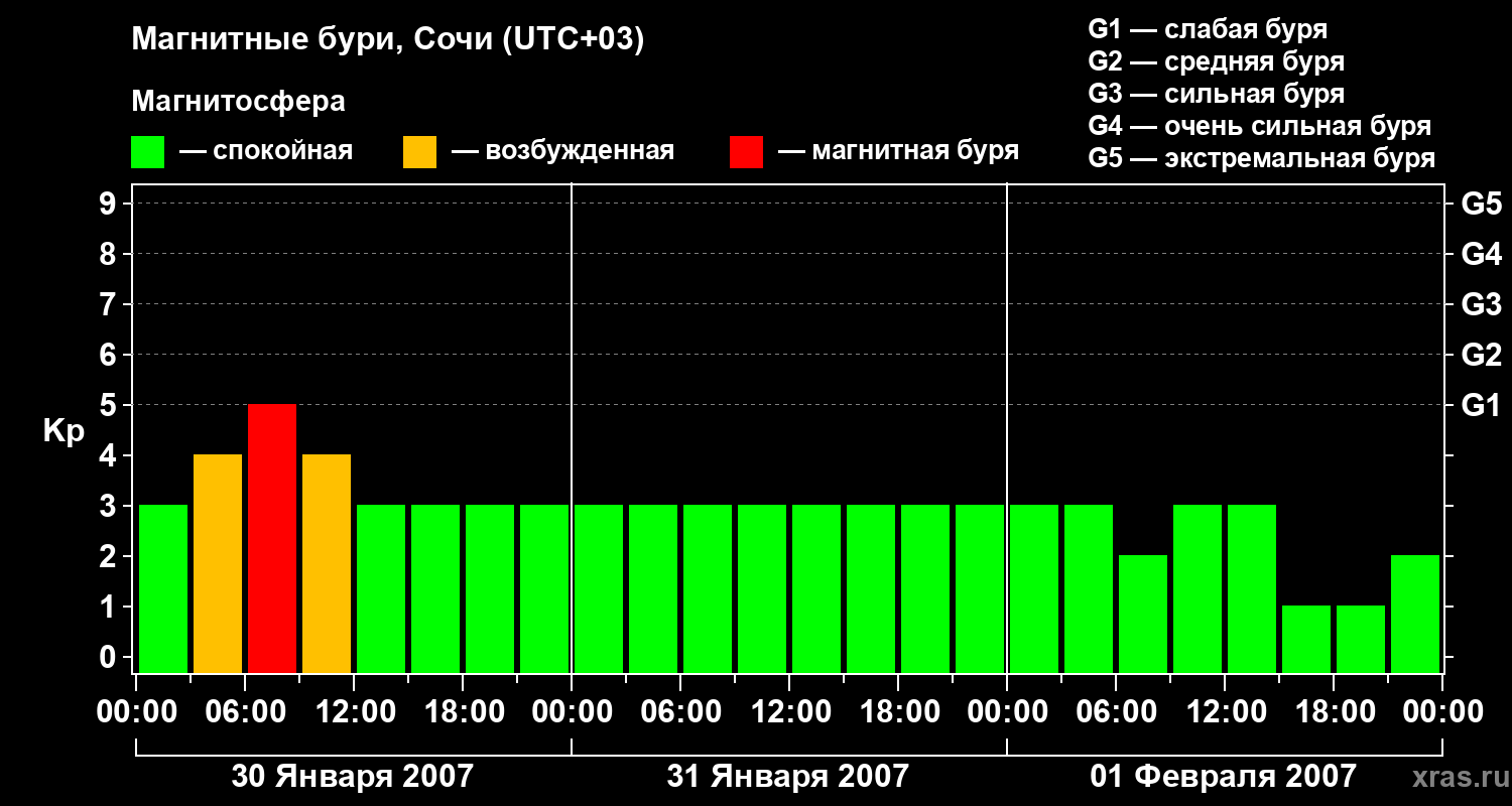 Изменения геомагнитного индекса Kp с 30 января по 1 февраля 2007 года для средних широт