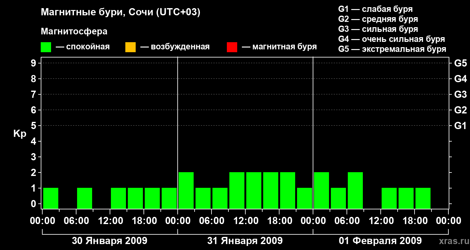Изменения геомагнитного индекса Kp с 30 января по 1 февраля 2009 года для средних широт