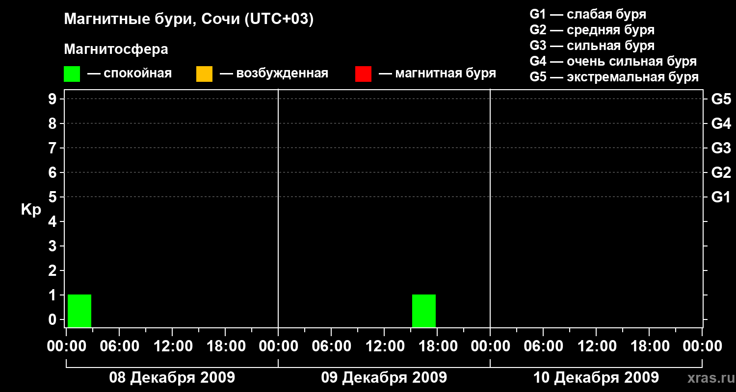 Изменения геомагнитного индекса Kp с 8 по 10 декабря 2009 года для средних широт