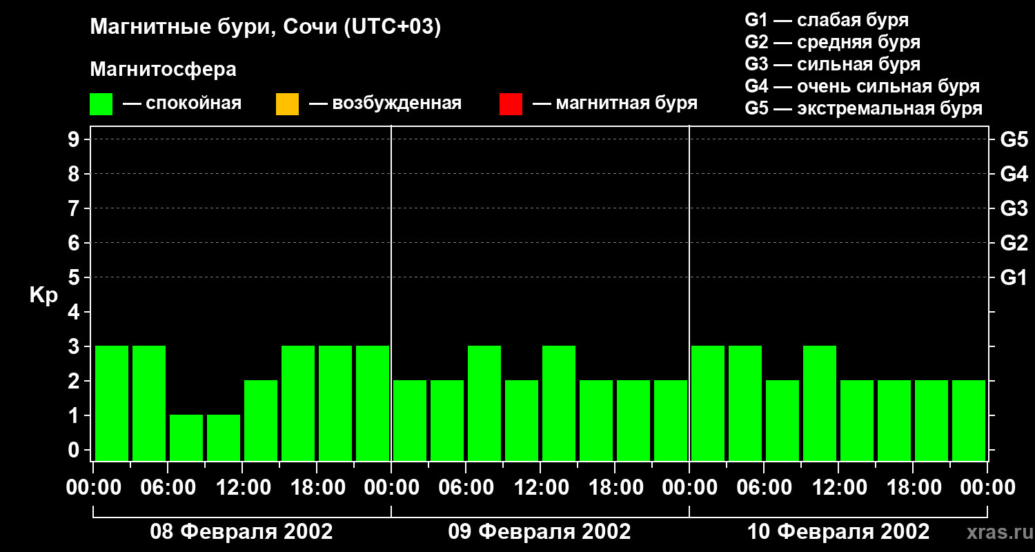Изменения геомагнитного индекса Kp с 8 по 10 февраля 2002 года для средних широт