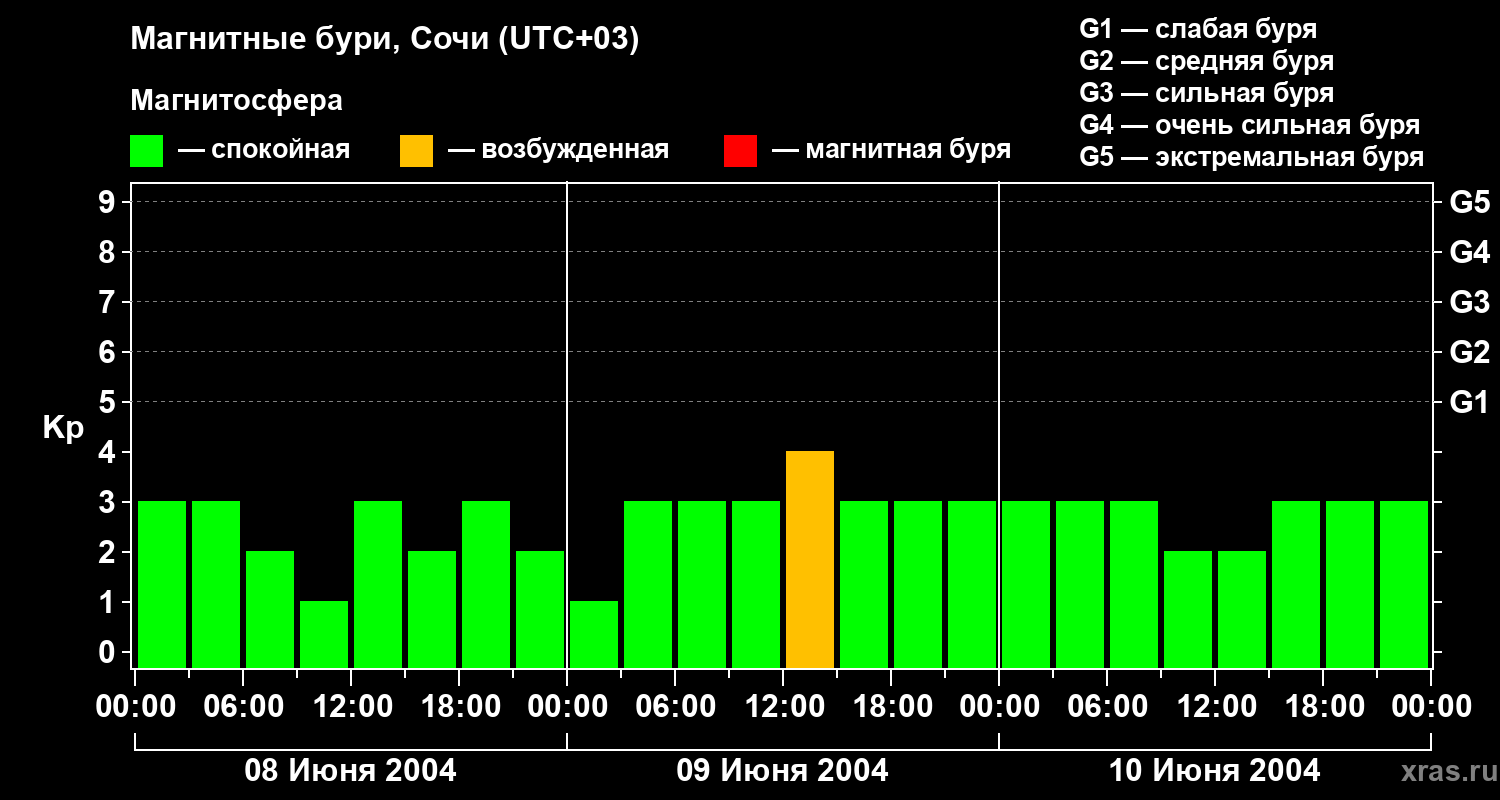 Изменения геомагнитного индекса Kp с 8 по 10 июня 2004 года для средних широт