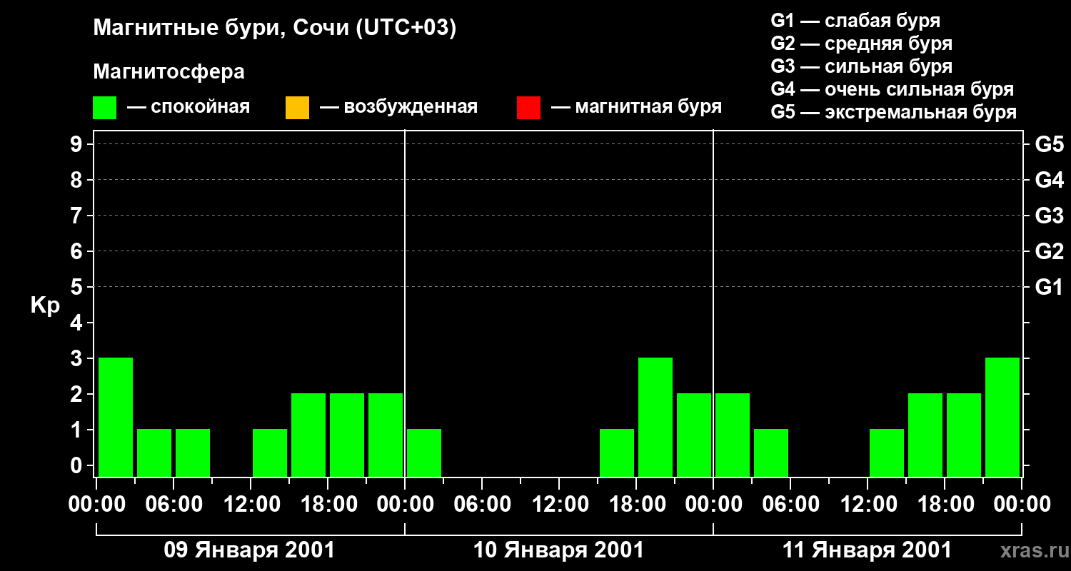 Изменения геомагнитного индекса Kp с 9 по 11 января 2001 года для средних широт