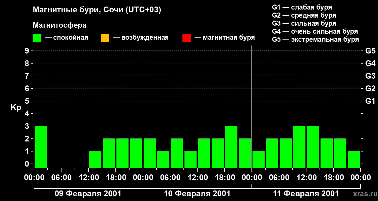 Изменения геомагнитного индекса Kp с 9 по 11 февраля 2001 года для средних широт