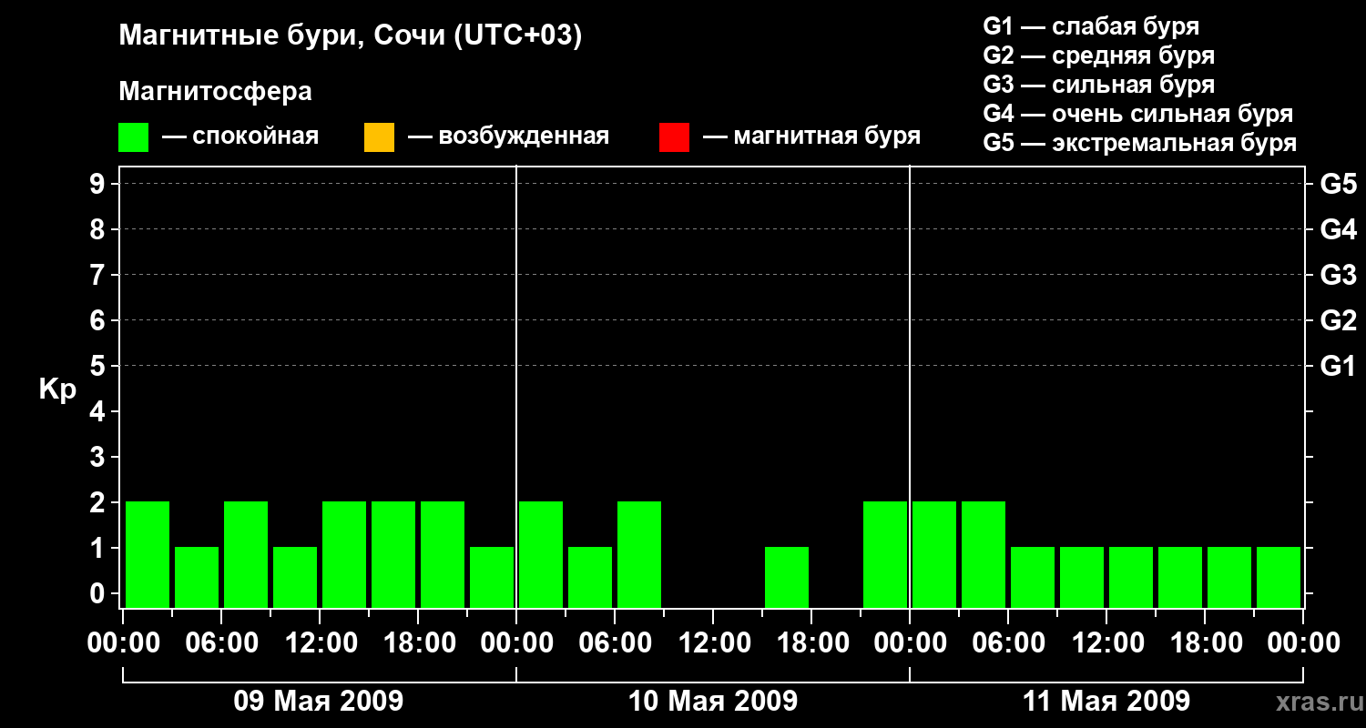 Изменения геомагнитного индекса Kp с 9 по 11 мая 2009 года для средних широт