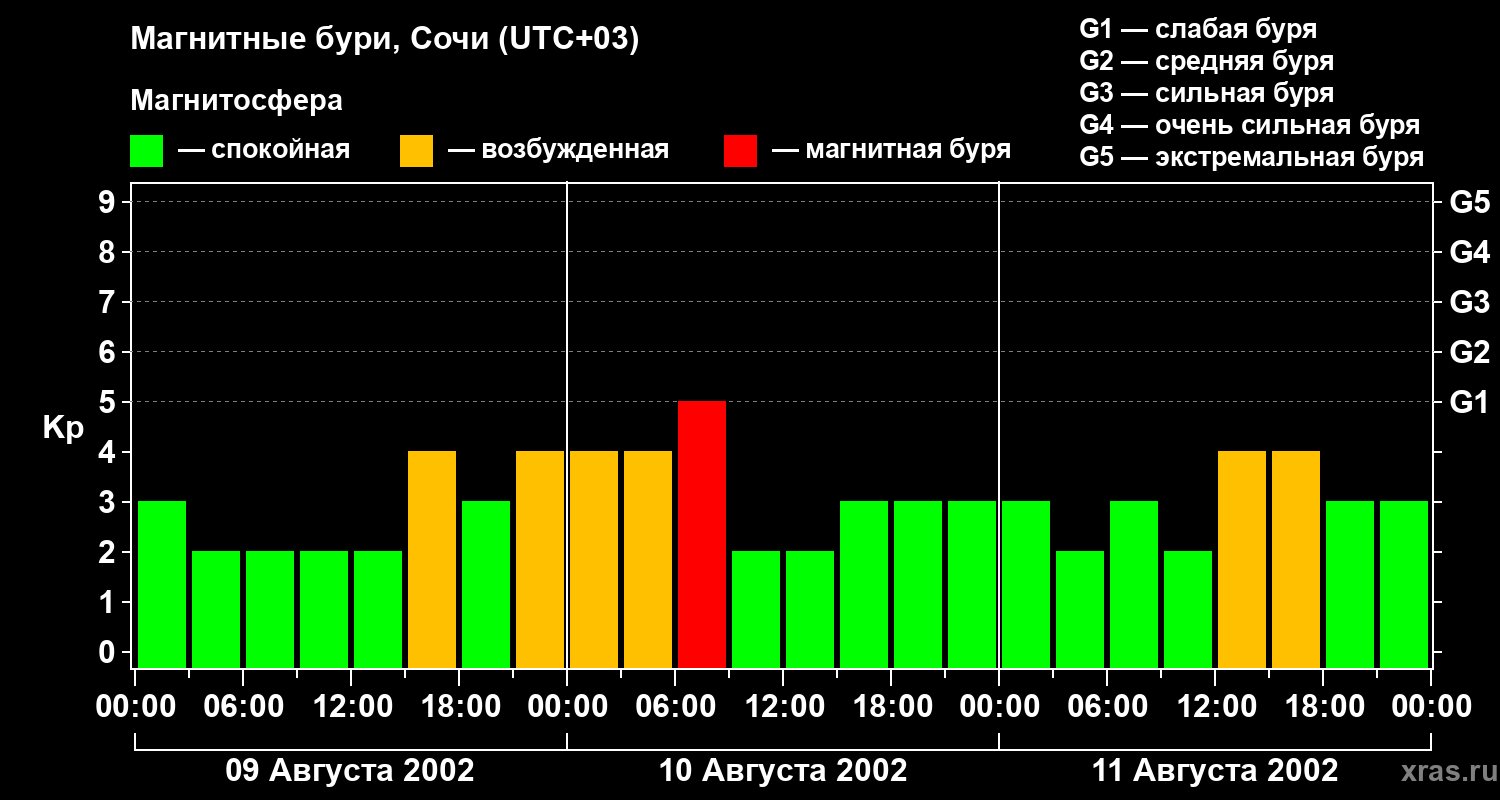 Изменения геомагнитного индекса Kp с 9 по 11 августа 2002 года для средних широт