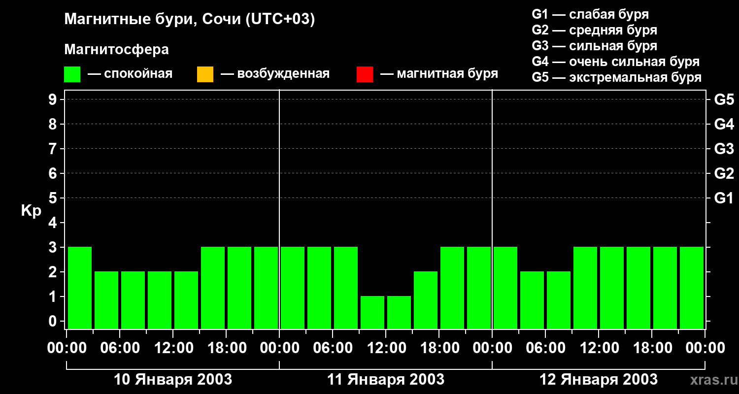 Изменения геомагнитного индекса Kp с 10 по 12 января 2003 года для средних широт