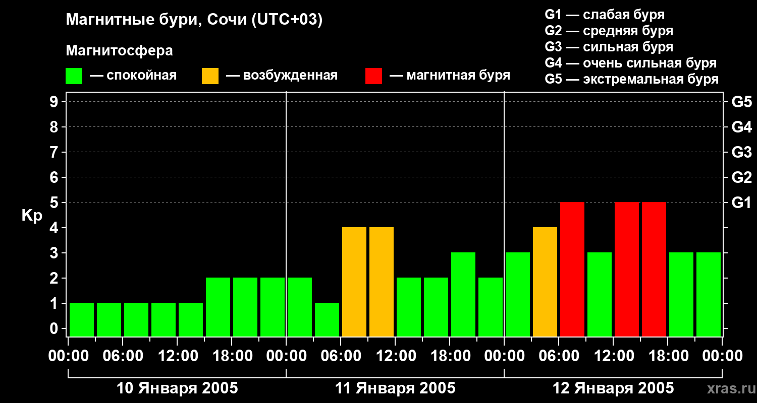 Изменения геомагнитного индекса Kp с 10 по 12 января 2005 года для средних широт