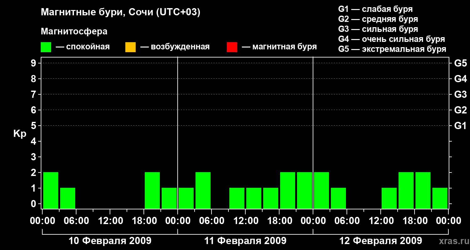 Изменения геомагнитного индекса Kp с 10 по 12 февраля 2009 года для средних широт