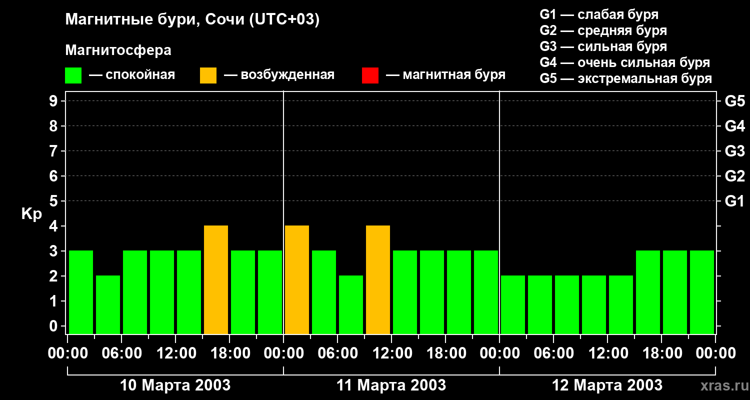 Изменения геомагнитного индекса Kp с 10 по 12 марта 2003 года для средних широт