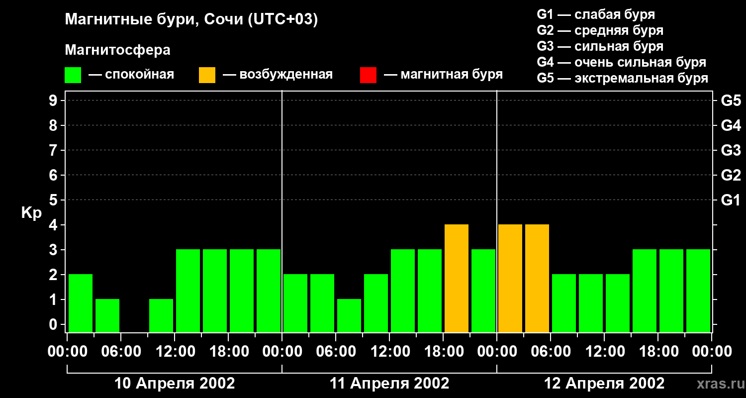 Изменения геомагнитного индекса Kp с 10 по 12 апреля 2002 года для средних широт