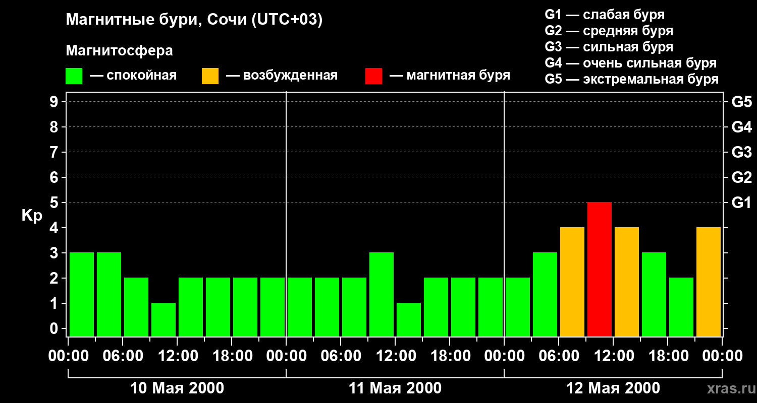 Изменения геомагнитного индекса Kp с 10 по 12 мая 2000 года для средних широт