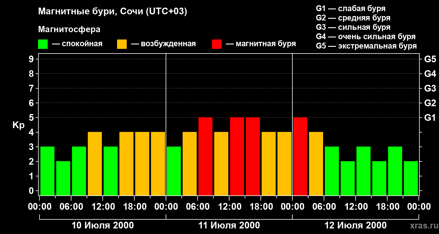 Изменения геомагнитного индекса Kp с 10 по 12 июля 2000 года для средних широт