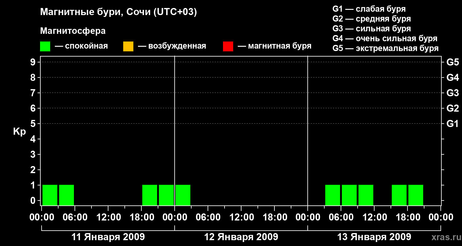 Изменения геомагнитного индекса Kp с 11 по 13 января 2009 года для средних широт