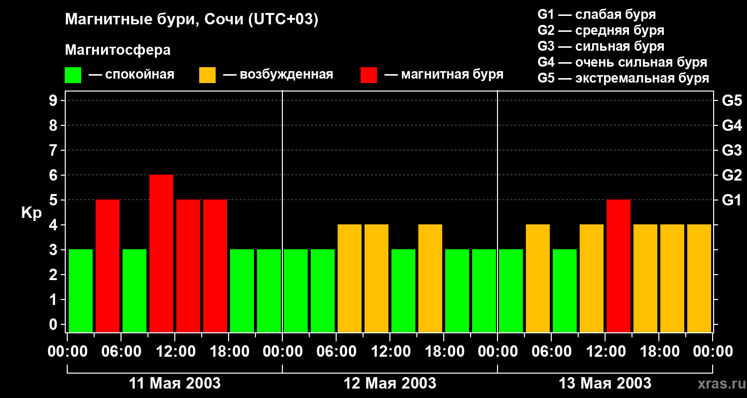 Изменения геомагнитного индекса Kp с 11 по 13 мая 2003 года для средних широт