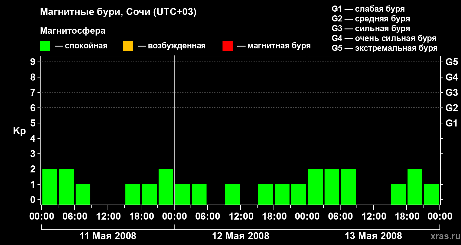 Изменения геомагнитного индекса Kp с 11 по 13 мая 2008 года для средних широт