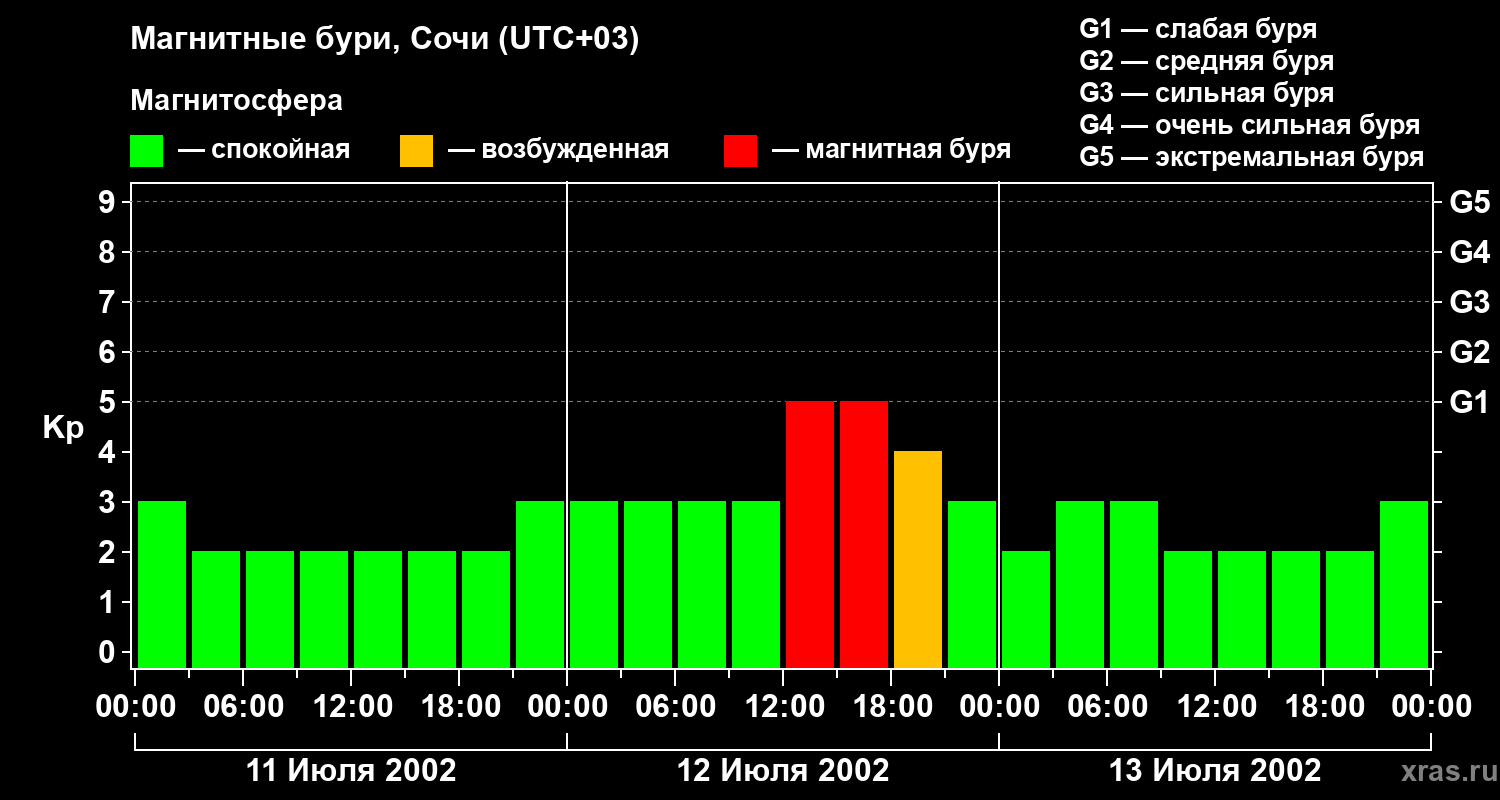 Изменения геомагнитного индекса Kp с 11 по 13 июля 2002 года для средних широт