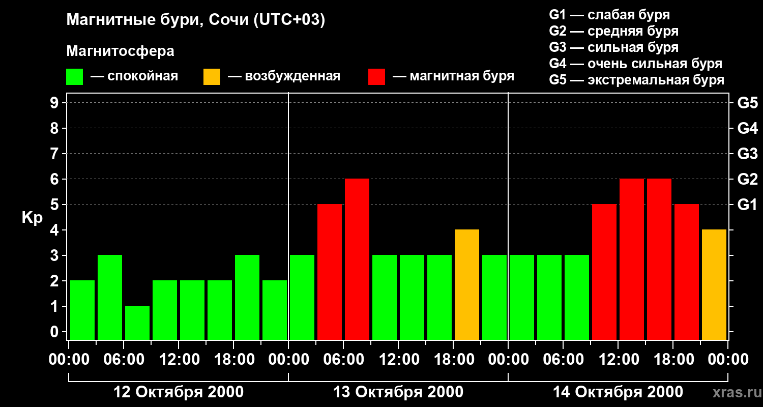 Изменения геомагнитного индекса Kp с 12 по 14 октября 2000 года для средних широт