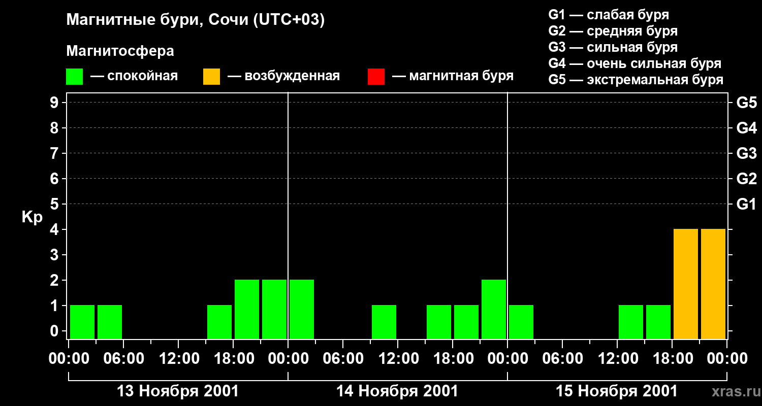 Изменения геомагнитного индекса Kp с 13 по 15 ноября 2001 года для средних широт