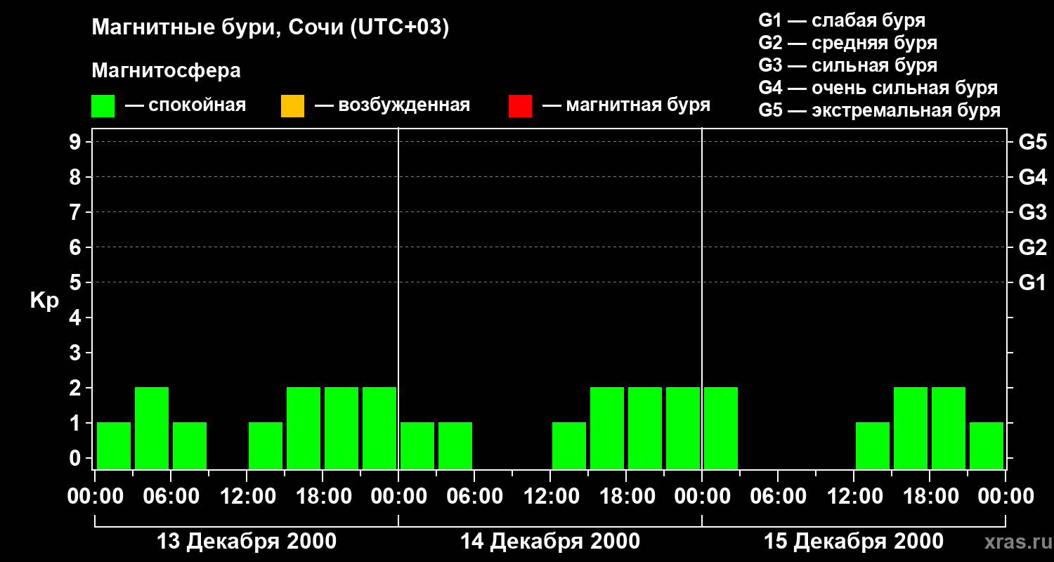 Изменения геомагнитного индекса Kp с 13 по 15 декабря 2000 года для средних широт