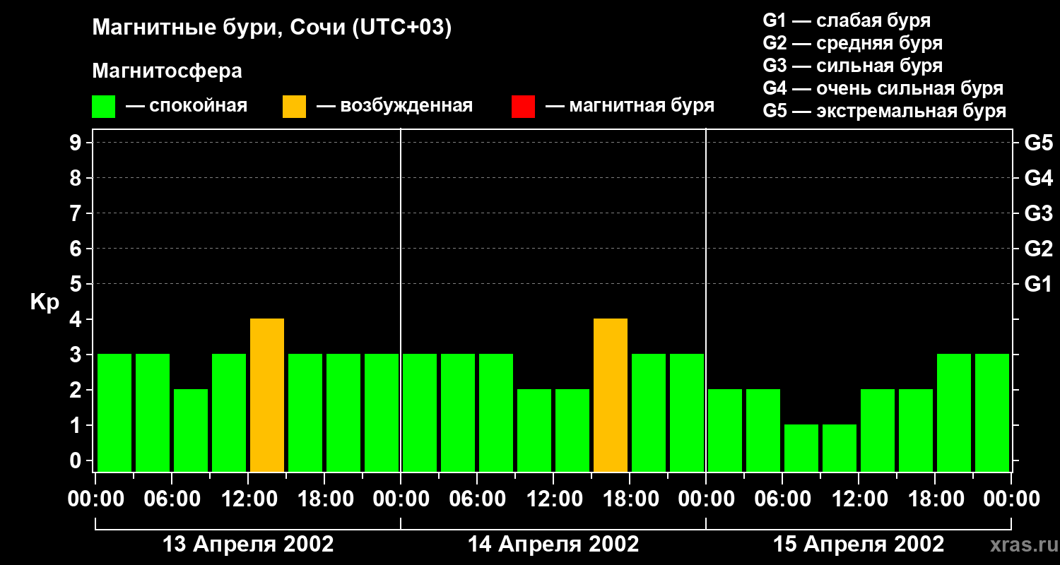 Изменения геомагнитного индекса Kp с 13 по 15 апреля 2002 года для средних широт