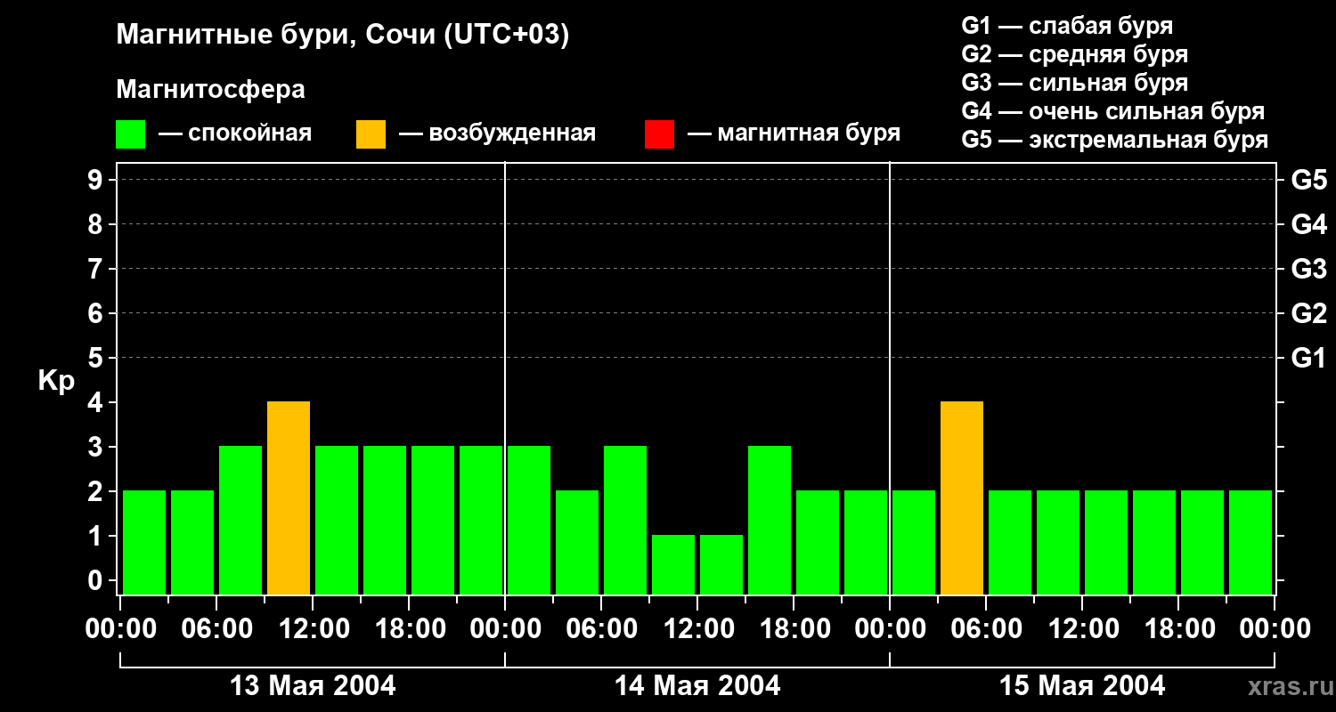 Изменения геомагнитного индекса Kp с 13 по 15 мая 2004 года для средних широт
