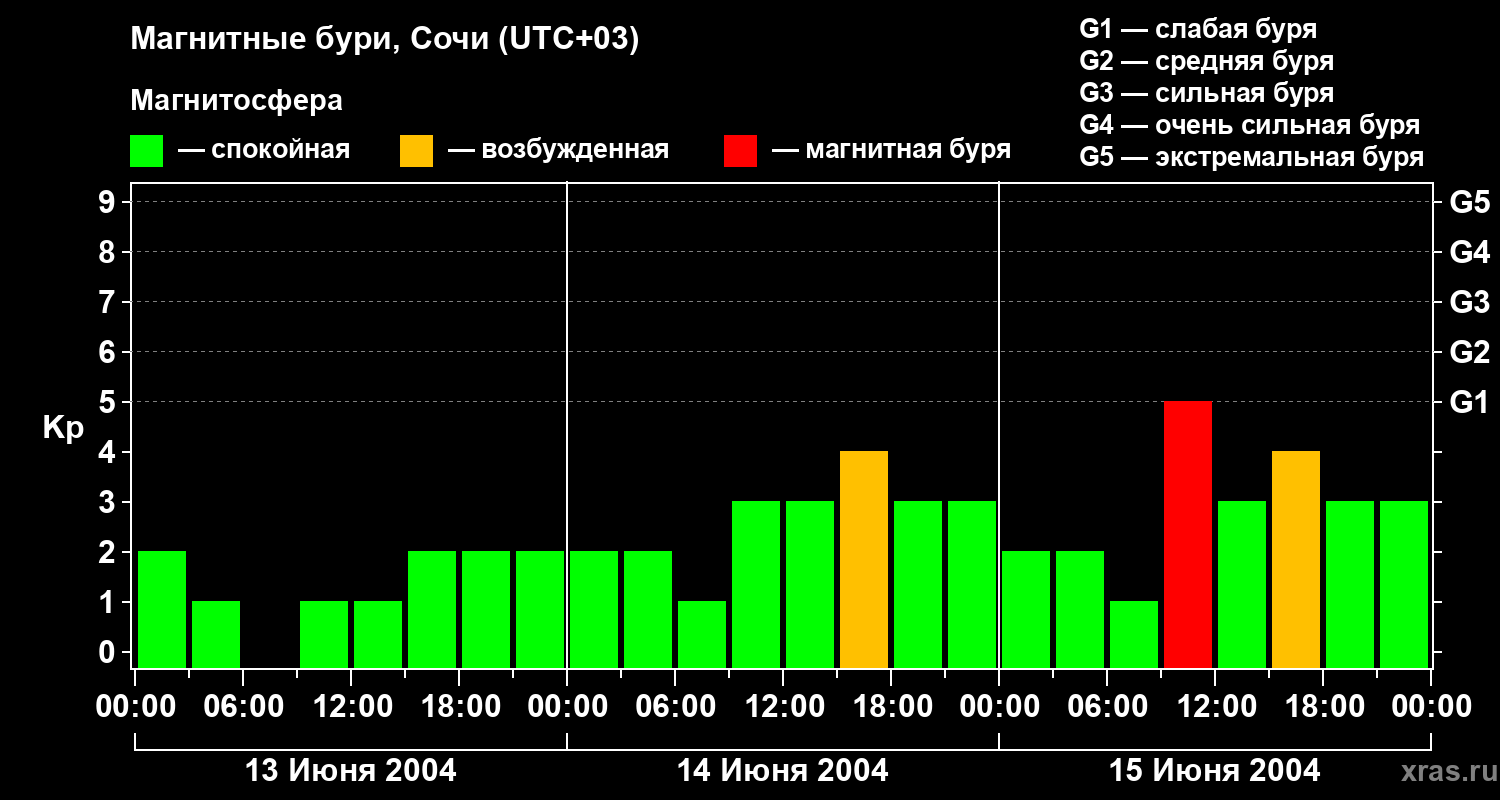 Изменения геомагнитного индекса Kp с 13 по 15 июня 2004 года для средних широт