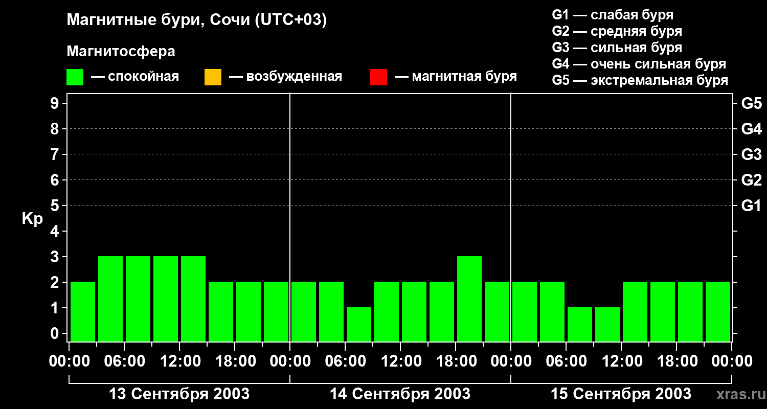 Изменения геомагнитного индекса Kp с 13 по 15 сентября 2003 года для средних широт