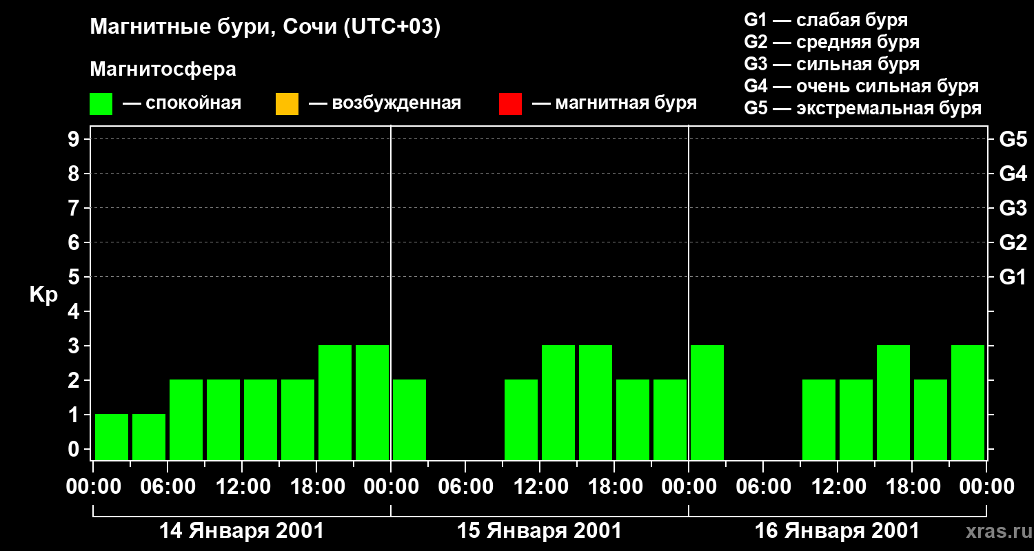 Изменения геомагнитного индекса Kp с 14 по 16 января 2001 года для средних широт