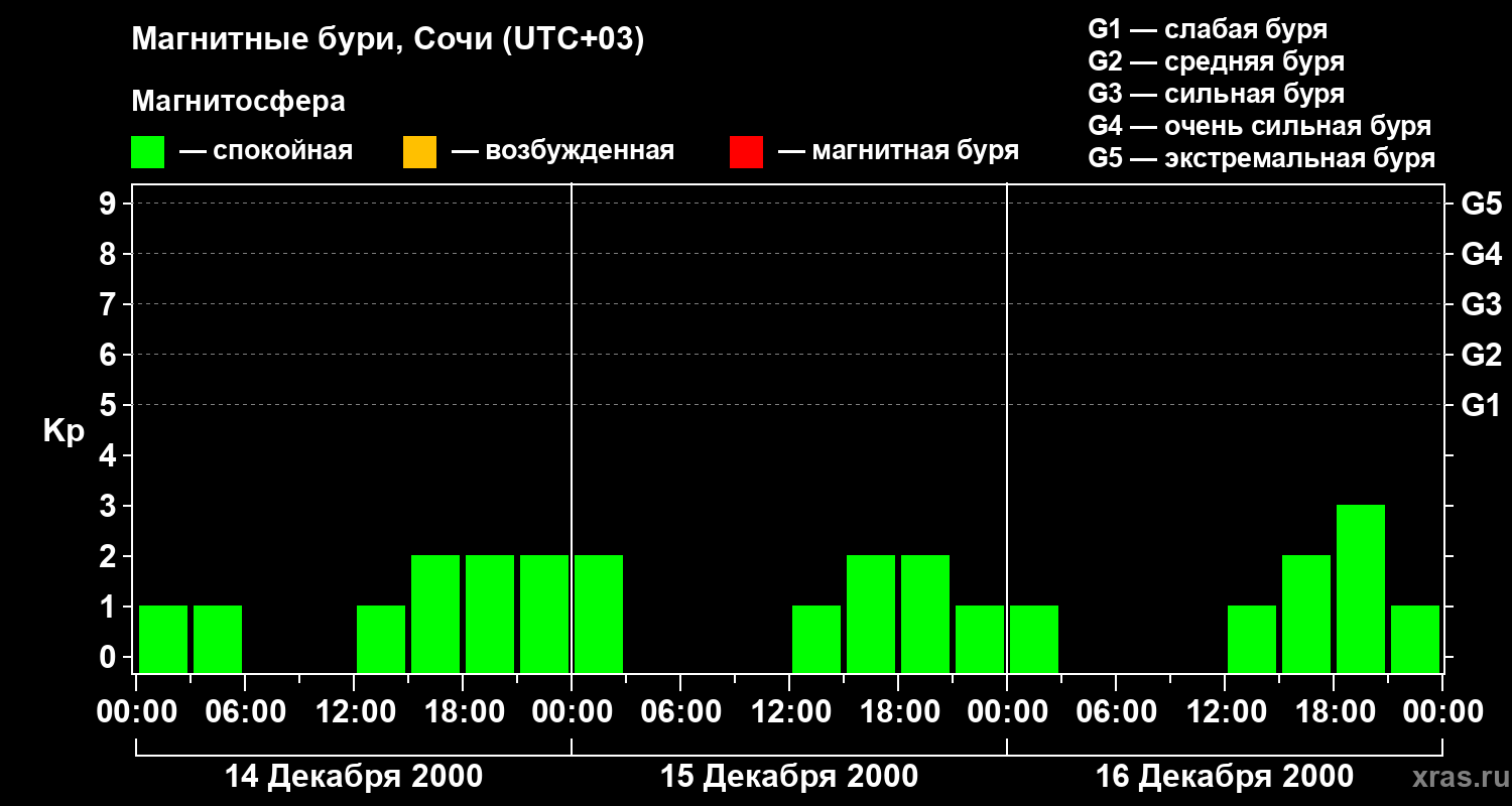 Изменения геомагнитного индекса Kp с 14 по 16 декабря 2000 года для средних широт