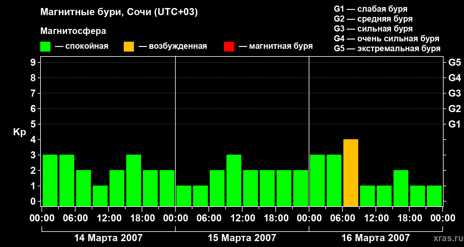 Изменения геомагнитного индекса Kp с 14 по 16 марта 2007 года для средних широт