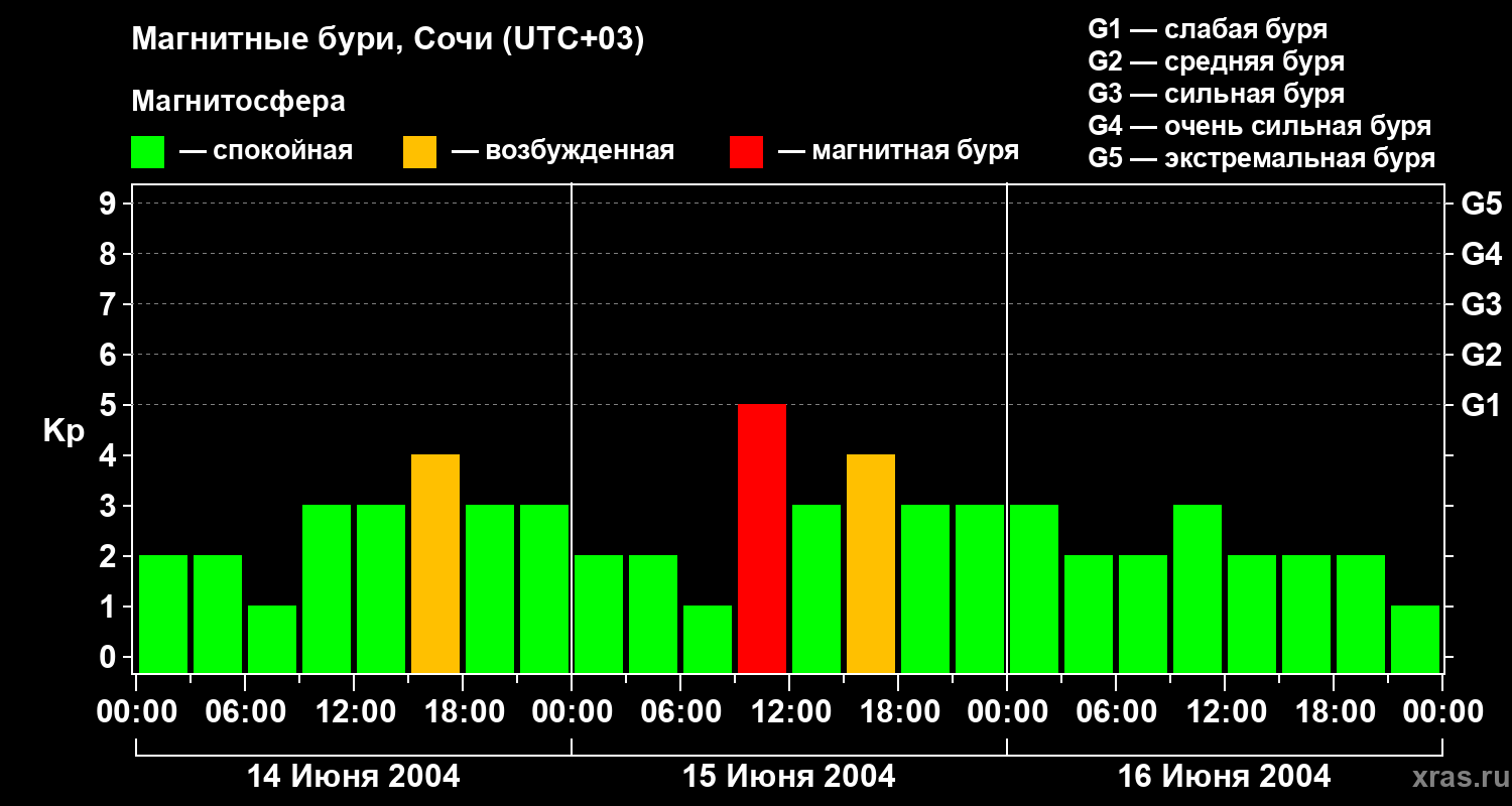 Изменения геомагнитного индекса Kp с 14 по 16 июня 2004 года для средних широт