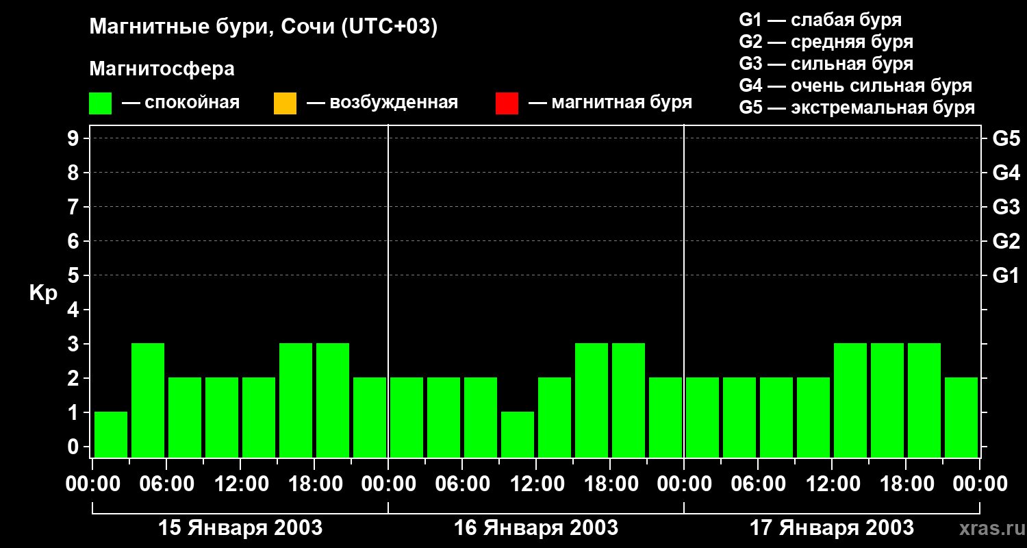 Изменения геомагнитного индекса Kp с 15 по 17 января 2003 года для средних широт