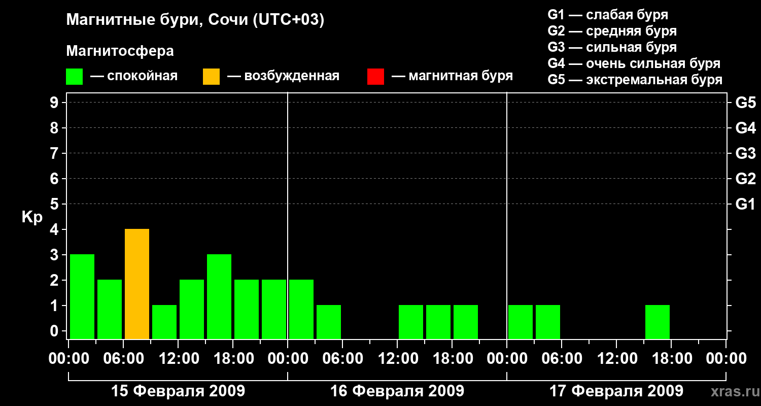 Изменения геомагнитного индекса Kp с 15 по 17 февраля 2009 года для средних широт
