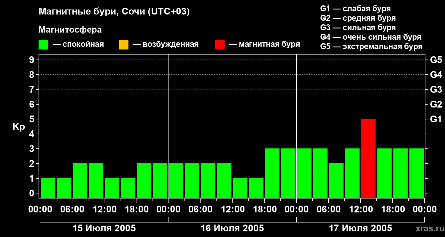Изменения геомагнитного индекса Kp с 15 по 17 июля 2005 года для средних широт