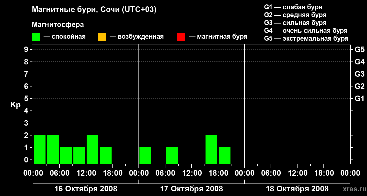 Изменения геомагнитного индекса Kp с 16 по 18 октября 2008 года для средних широт