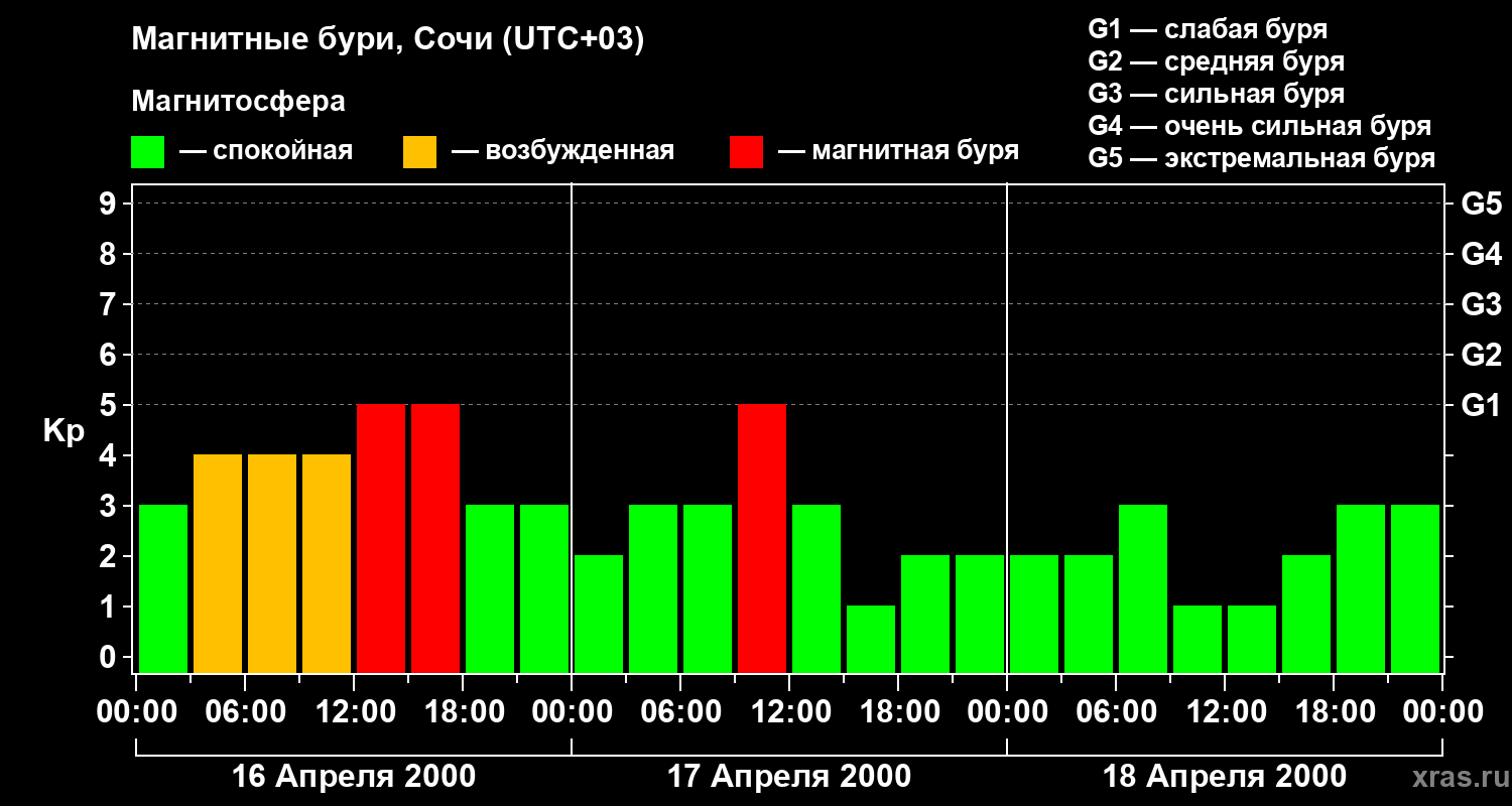 Изменения геомагнитного индекса Kp с 16 по 18 апреля 2000 года для средних широт