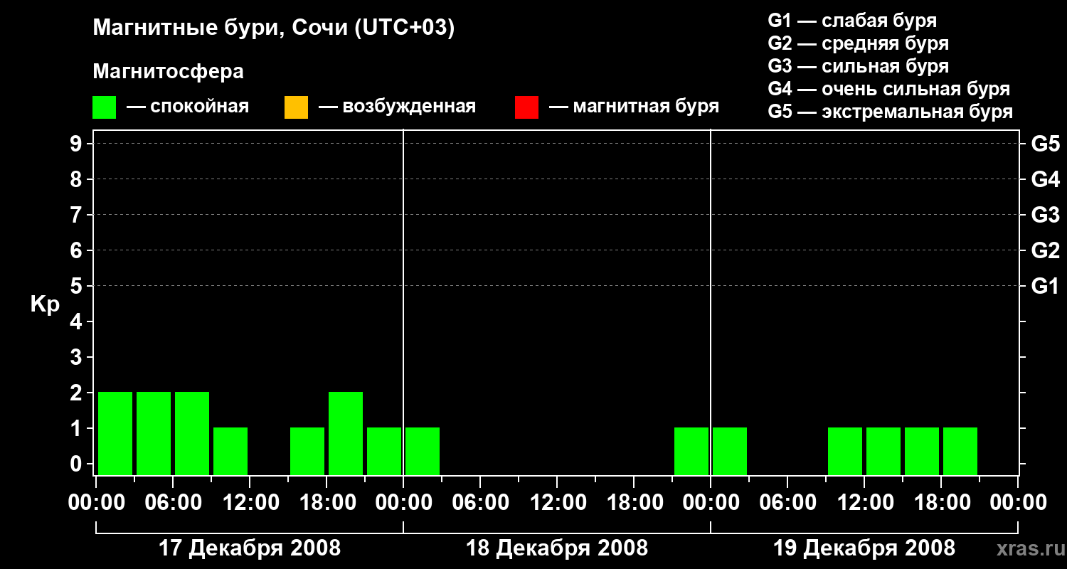 Изменения геомагнитного индекса Kp с 17 по 19 декабря 2008 года для средних широт