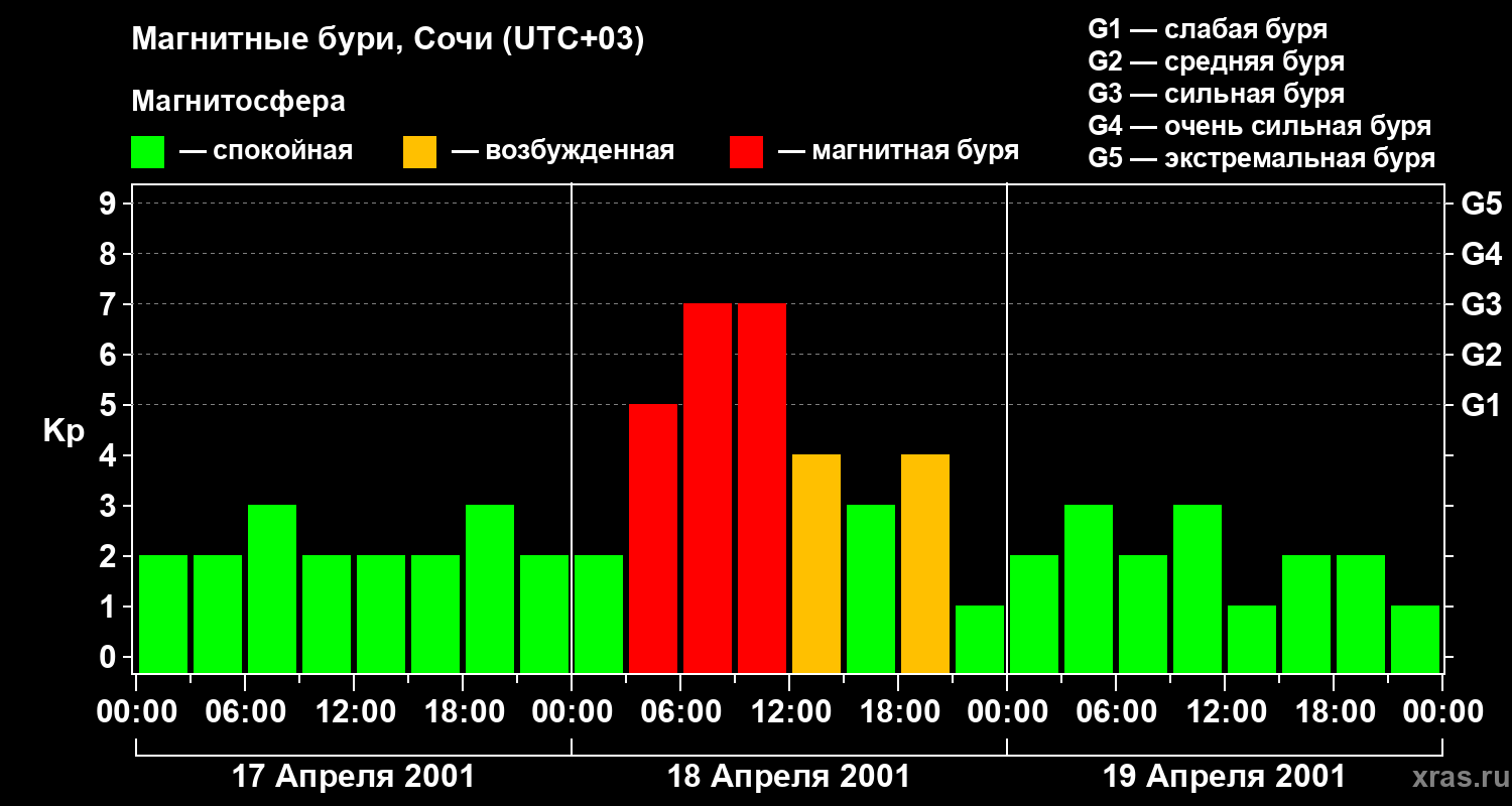 Изменения геомагнитного индекса Kp с 17 по 19 апреля 2001 года для средних широт