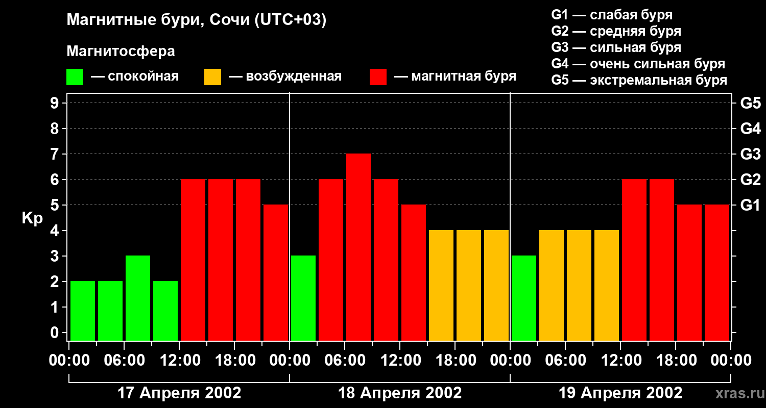 Изменения геомагнитного индекса Kp с 17 по 19 апреля 2002 года для средних широт