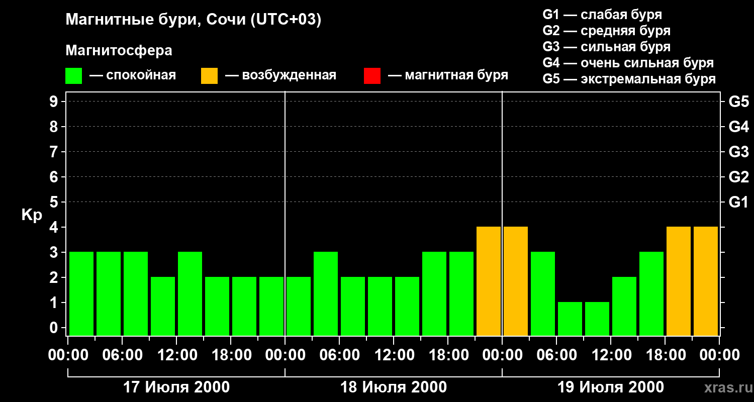 Изменения геомагнитного индекса Kp с 17 по 19 июля 2000 года для средних широт