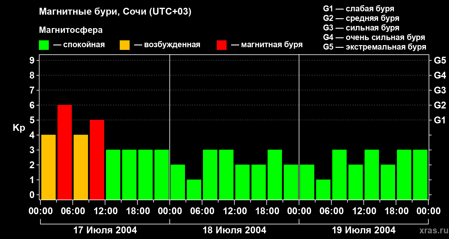 Изменения геомагнитного индекса Kp с 17 по 19 июля 2004 года для средних широт