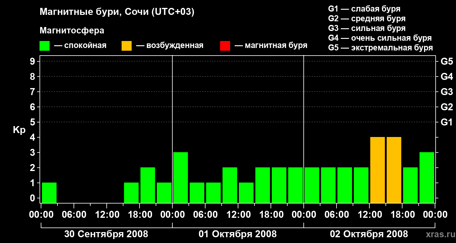 Изменения геомагнитного индекса Kp с 30 сентября по 2 октября 2008 года для средних широт