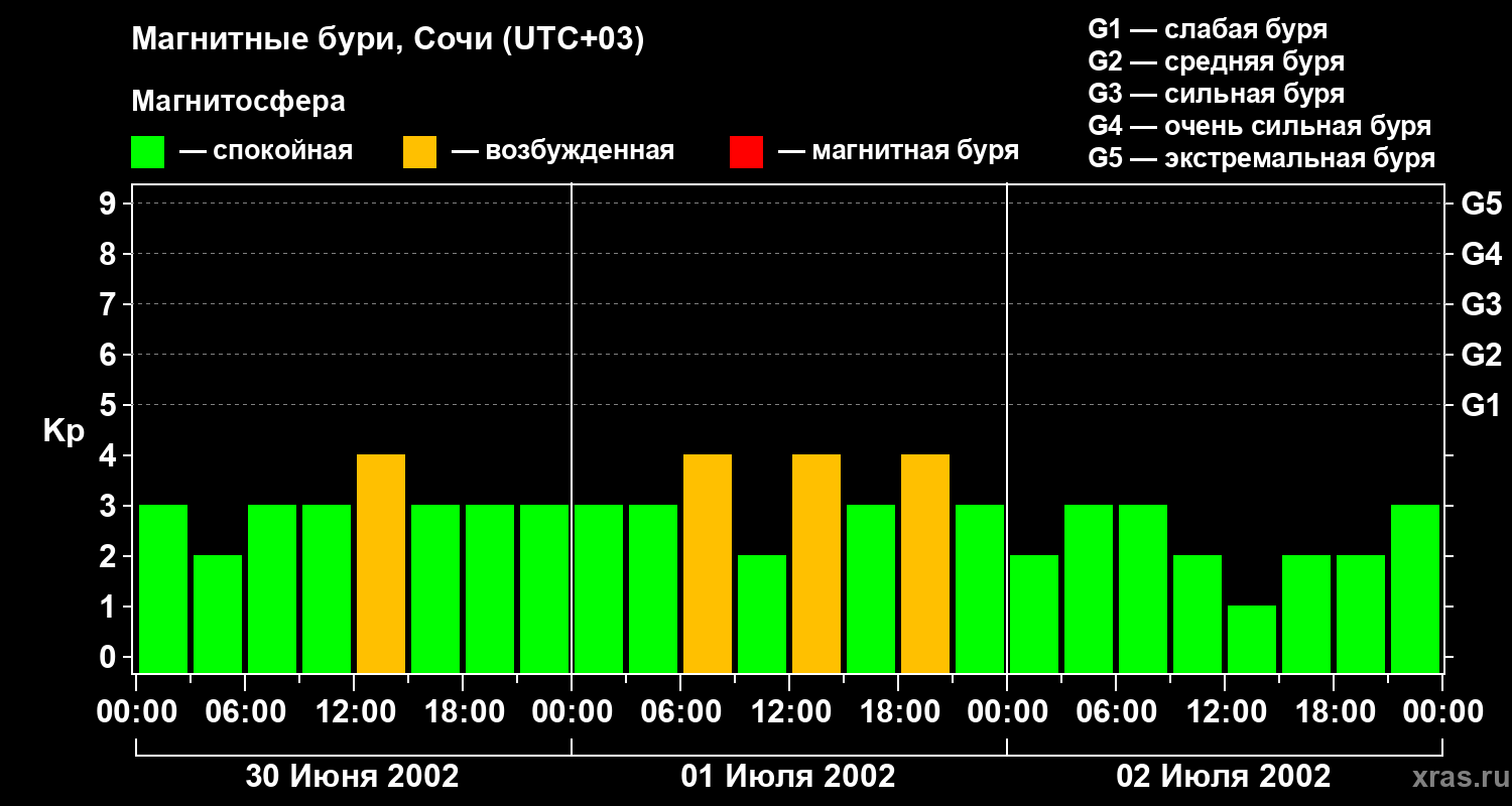 Изменения геомагнитного индекса Kp с 30 июня по 2 июля 2002 года для средних широт