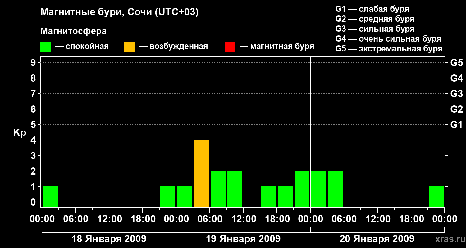 Изменения геомагнитного индекса Kp с 18 по 20 января 2009 года для средних широт