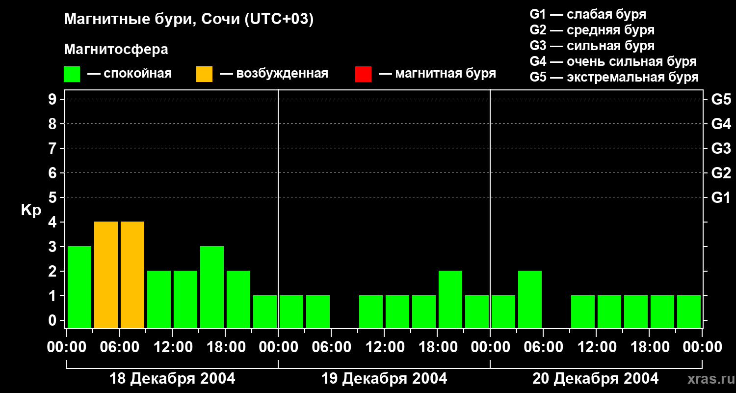 Изменения геомагнитного индекса Kp с 18 по 20 декабря 2004 года для средних широт
