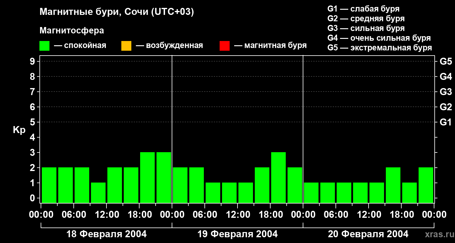 Изменения геомагнитного индекса Kp с 18 по 20 февраля 2004 года для средних широт