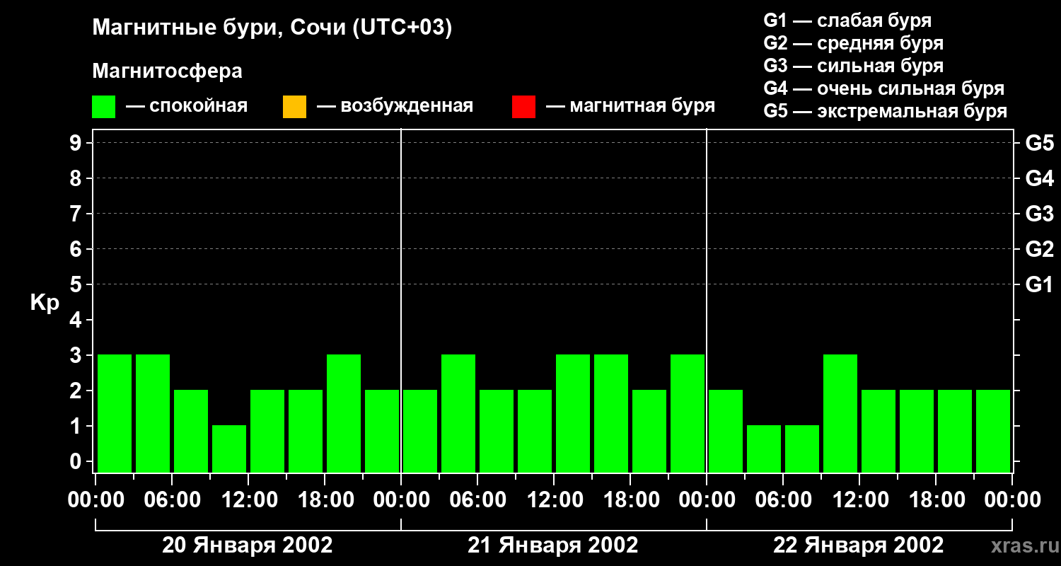 Изменения геомагнитного индекса Kp с 20 по 22 января 2002 года для средних широт
