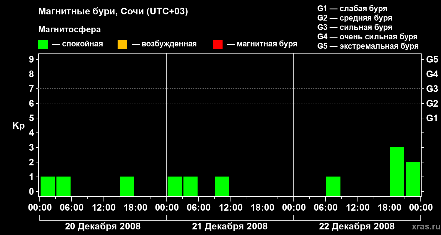 Изменения геомагнитного индекса Kp с 20 по 22 декабря 2008 года для средних широт